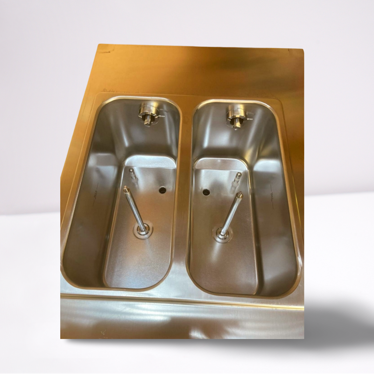 Die Maschine kann viel Eis produzieren, und die zwei getrennten Becken erlauben verschiedene Sorten parallel, evtl. sogar mit unterschiedlicher Konsistenz. -